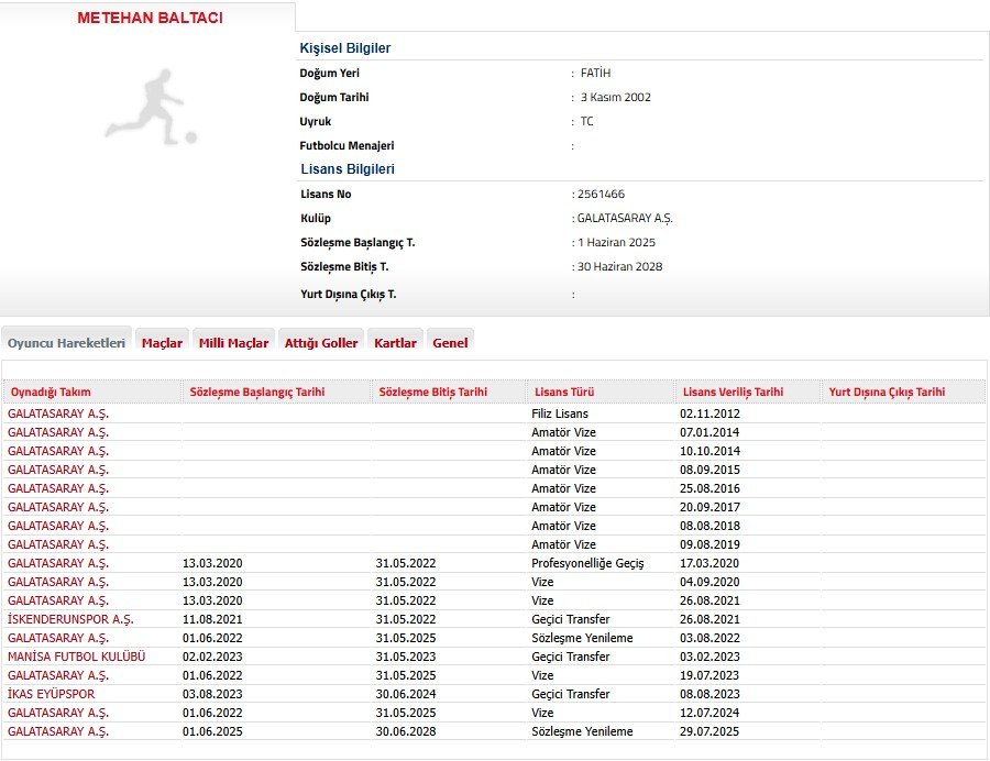 Galatasaray; Abdülkerim Bardakcı ve Kaan Ayhan’ın ardından Metehan Baltacı’nın sözleşmesinin 2028’e kadar uzatıldığını TFF’ye bildirdi.