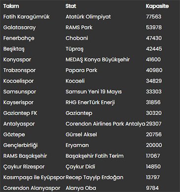 Türkiye Futbol Federasyonu verilerine göre, Süper Lig’de 2025-2026 sezonunda oynanacak maçların yapılacağı statların seyirci kapasiteleri şu şekilde: