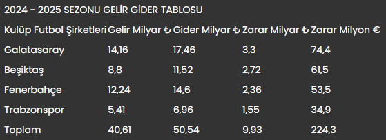 Toplamda 40,61 milyar liralık gelire ulaşan futbol kulüplerinin gider toplamı ise 50,54 milyar liraya ulaştı. Böylece dört büyükler sadece geçen sezonu 9,93 milyar zararla kapattı. Bu zararın dönemsel kur karşılığı ise 224,3 milyon avro.