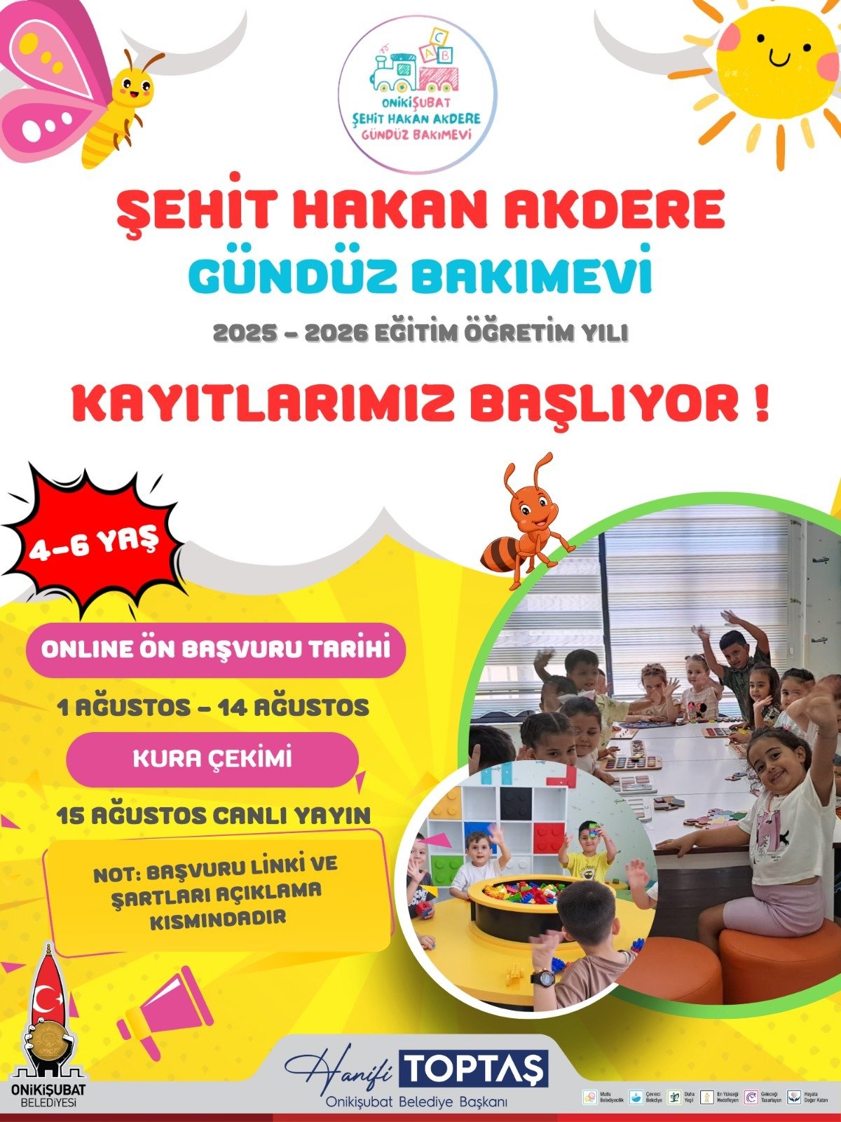Onikişubat Belediyesi, Başkan Hanifi Toptaş’ın öncülüğünde hizmete sunduğu Şehit Hakan Akdere Gündüz Bakımevi’nde yeni dönem kayıtları için süreci başlattı. “Minik Kalpler Bize Emanet” sloganıyla hayata geçirilen bu özel merkez, 4-6 yaş arası çocuklar için kapılarını yeniden açmaya hazırlanıyor. Online ön başvurular, 1 – 14 Ağustos 2025 tarihleri arasında alınacak. Kura çekimi ise 15 Ağustos’ta noter huzurunda gerçekleştirilecek.