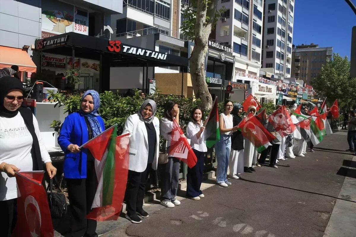 Gaziantep’te 15 Temmuz Demokrasi Meydanı’nda bir araya gelen kadınlar, “Gazze İçin Sessiz Çığlık” zinciri oluşturdu.