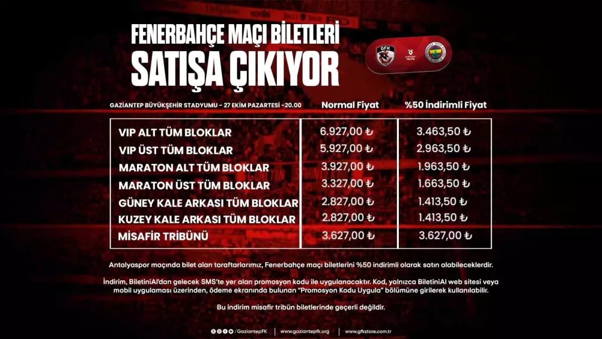 Gaziantep Futbol Kulübü, Trendyol Süper Lig’in 10. haftasında 27 Ekim Pazartesi günü saat 20.00’da Fenerbahçe’yi konuk edecek. Bu mücadelenin biletleri bugün 14.00 itibariyle satışa çıkacak. Gaziantep Büyükşehir Stadyumu’nda oynanacak zorlu karşılaşmanın bilet fiyatları ev sahibi takım için 2 bin 827 TL ile 6 bin 927 TL arasında belirlenirken, misafir tribün bilet fiyatları ise 3 bin 627 TL oldu.