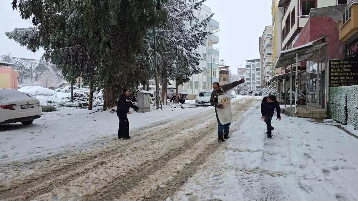 İslahiyeli esnaflar ise yağan karın keyfini kar topu oynayarak çıkarttı. – GAZİANTEP